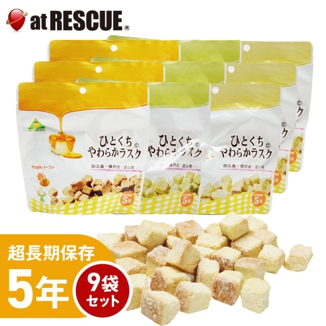【合計9袋】3種入り 5年保存 非常食・保存食 ひとくちやわらかラスクセット メロン70g3袋 チョコ70g3袋 メープル70g3袋【取寄せ品】