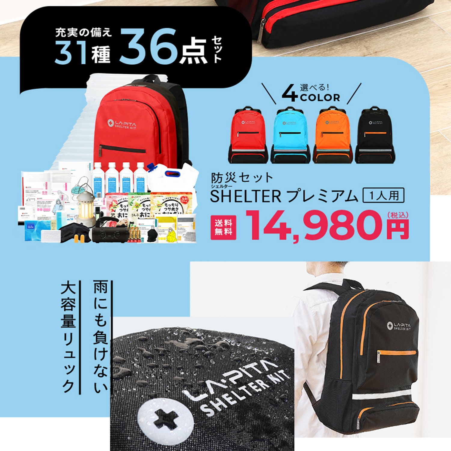 耐寒温度:-30℃取扱説明書×1 防災セットの商品リストや注意事項などを記載しています。 【関連ワード】防災グッズ アットレスキュー 防災セット シェルター 災害対策 避難用品 非常用 リュック 撥水 赤 レッド ターコイズ ブルー 水色 青 オレンジ 黒 ブラック 非常持ち出し袋 非常持ち出し おすすめ リスト 最低限 経験者 地震対策 地震対策グッズ 震災グッズ 避難セット 避難グッズ 避難防災セット 避難リュック 避難・持出用品 災害 グッズ 災害 リュック 水害対策 防災 セット リュック 非常時用 災害支援 被災支援 デザイン性にこだわりオシャレな防災セットと評判 テレビCM放送中 CM 防災セットはラピタ TVCM