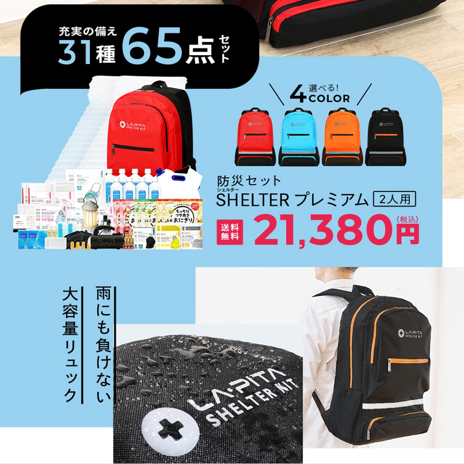 耐寒温度:-30℃取扱説明書×1 防災セットの商品リストや注意事項などを記載しています。 【関連ワード】防災セット シェルター 非常用 災害対策 避難用品 非常持ち出し袋 非常持ち出し 2人用 家族2人用 地震対策 地震対策グッズ 震災グッズ 避難セット 避難グッズ 避難防災セット 赤 レッド ターコイズ ブルー 水色 青 オレンジ 黒 ブラック 避難リュック 避難・持出用品 災害 グッズ 災害 リュック 水害対策 防災 セット リュック 非常時用 災害支援 被災支援 デザイン性にこだわりオシャレな防災セットと評判 テレビCM放送中 CM テレビCM 防災セットはラピタ TVCM 忘れない 熊本地震 3.11 東北 東日本大震災
