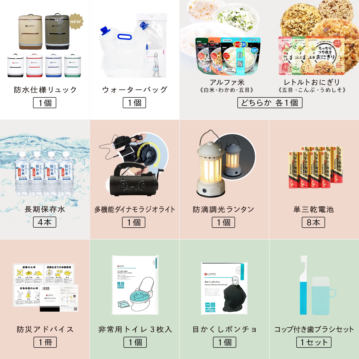 防災セット ラピタ プレミアム 1人用 デザイン性にこだわる高機能な防水リュックを採用
