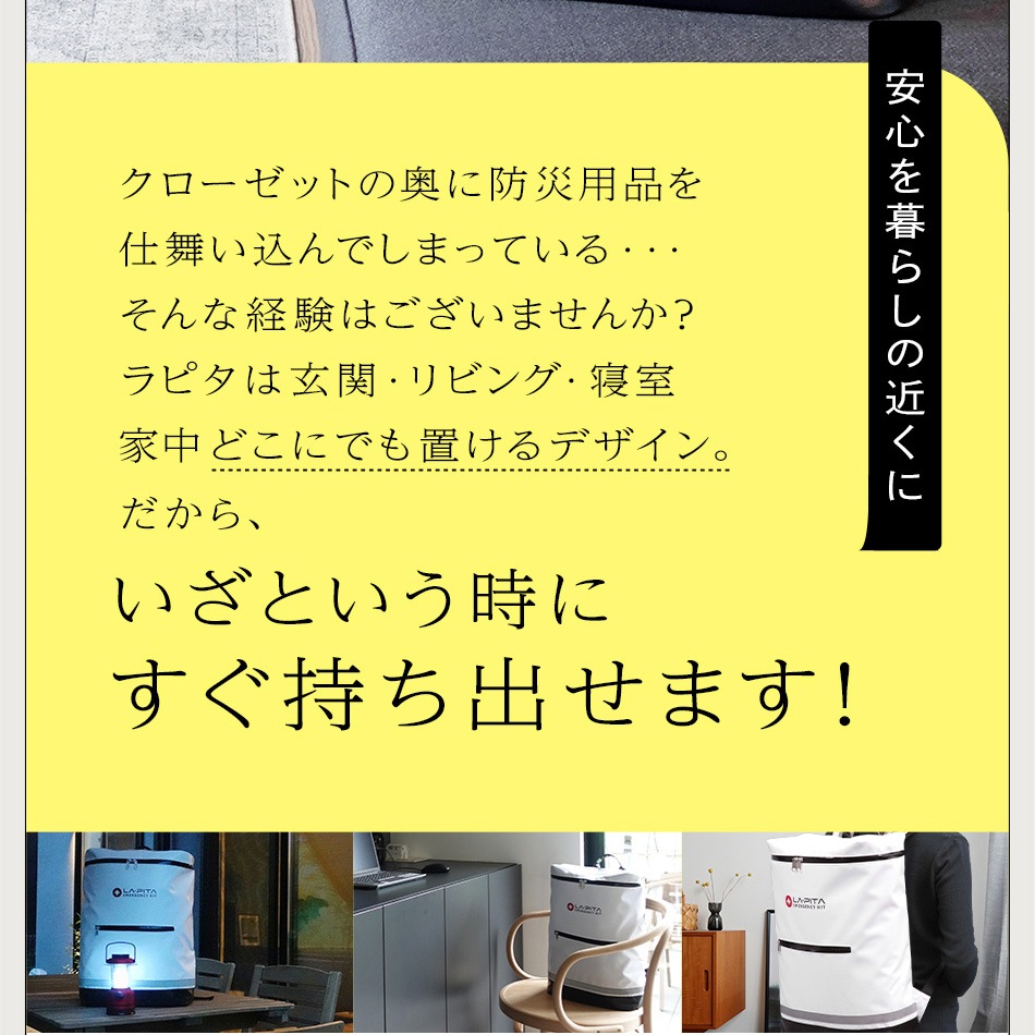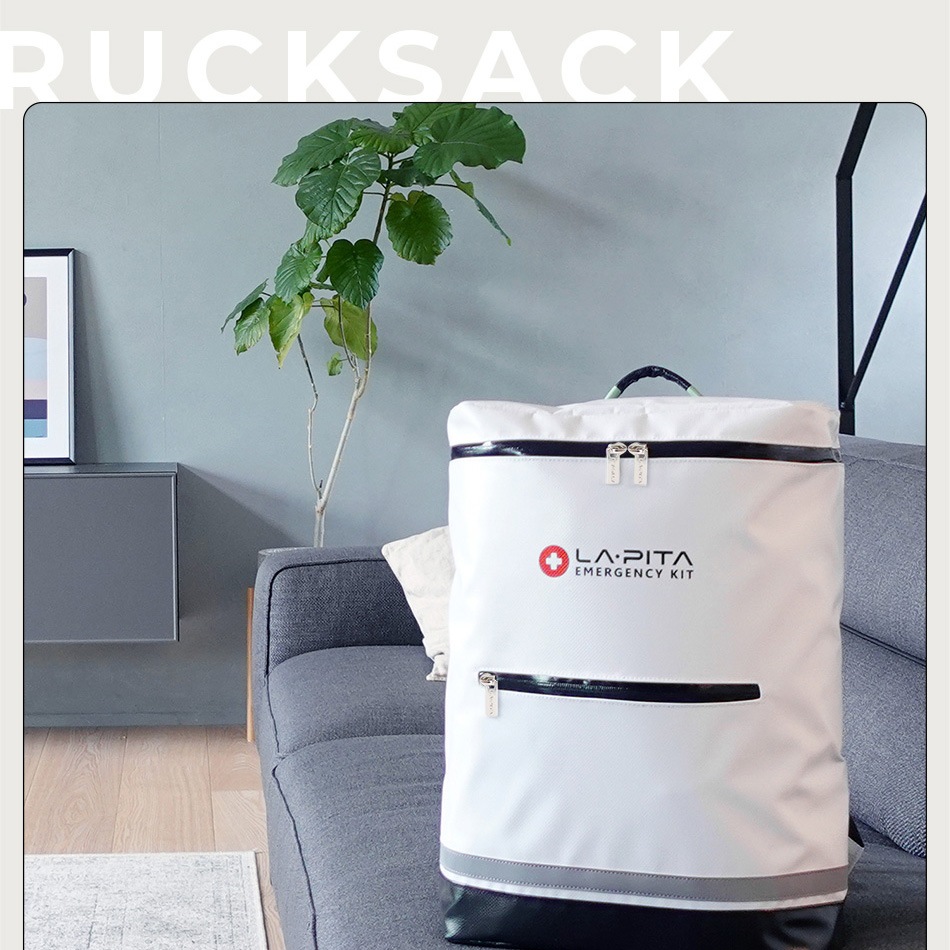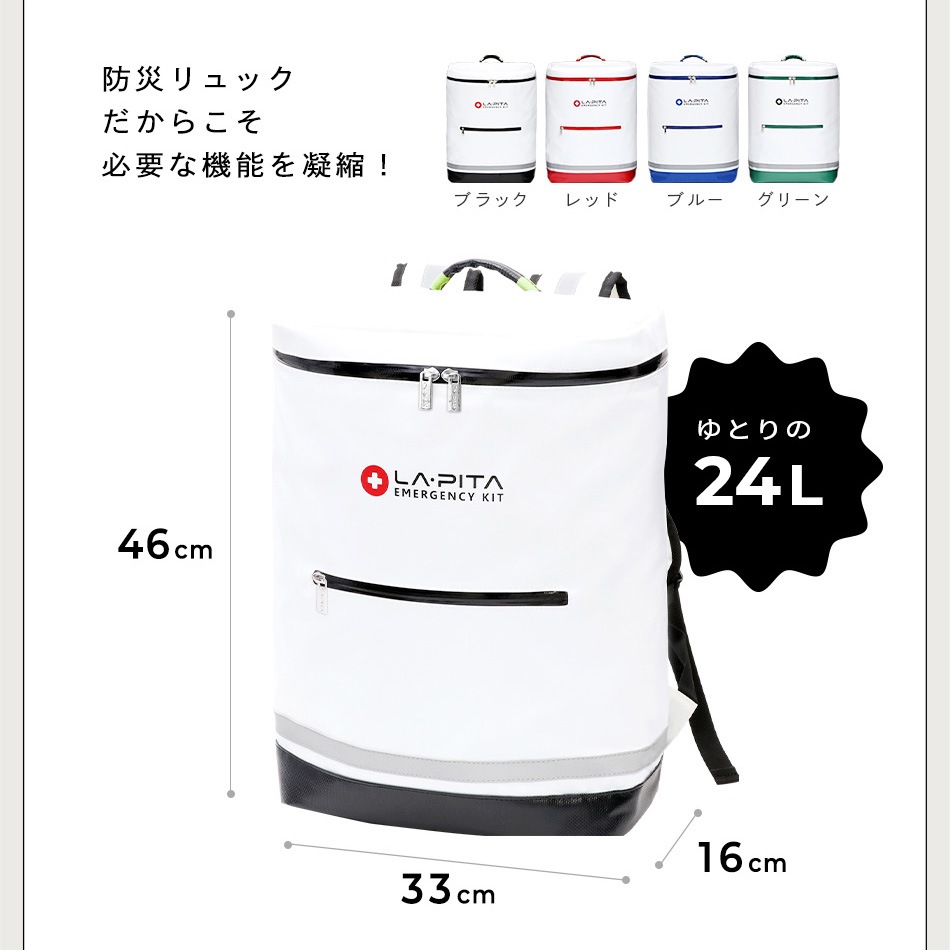 リュック バッグ 非常用持ち出し袋 スタイリッシュ デザイン性 背負う 鞄 かばん バック 撥水 水を弾く ブラック ホワイト 白 黒 赤 レッド ブルー 青 グリーン 緑 防水 雨 豪雨 台風 水害 転がす キャリーバッグ リュックサック バックパック ぼうさい LA・PITA ラピタ ラ・ピタ 防災グッズ 防災グッツ 防災グッヅ 防災用品 避難用品 地震対策 災害対策 避難グッズ アットレスキュー 非常用