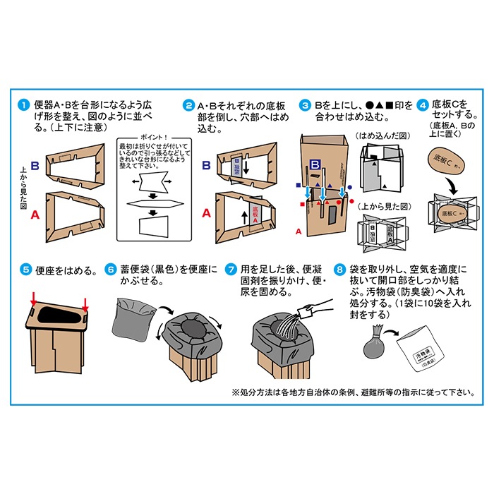汚物袋:ポリエチレン、ナイロンサイズ(組立時) W325×H370×D380mm サイズ(パッケージ) W340×H400×D90mm 重量 1,300g セット内容 便器A、B・便座・底板×各1、 蓄便袋×10、便凝固剤×10、汚物袋(防臭袋)×1