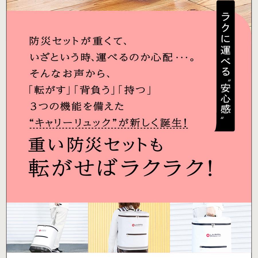 防水性・撥水性に優れたターポリン生地や止水ファスナーを採用しデザイン段階からこだわって開発された機能性豊かな「ラピタ」の防災リュックが“キャリーリュック”になって登場!防水性が高い為、地震対策としての非常用持ち出し袋としてはもちろんのこと、台風やゲリラ豪雨の際の避難セットとしてもご活用いただけます。転がす・背負う・持つの3wayで状況に応じで持ち運びが選べて便利!安心国内産の保存水やアルファ米、防災エアーマットを標準装備した防災セットです。防災セットが、またひとつ新しいステージへ。