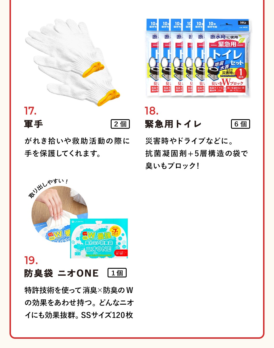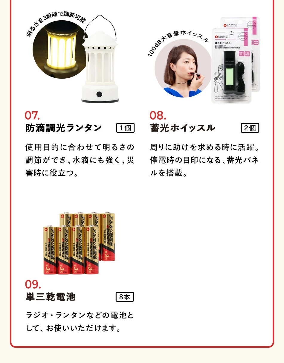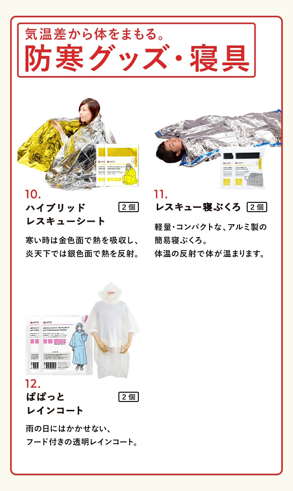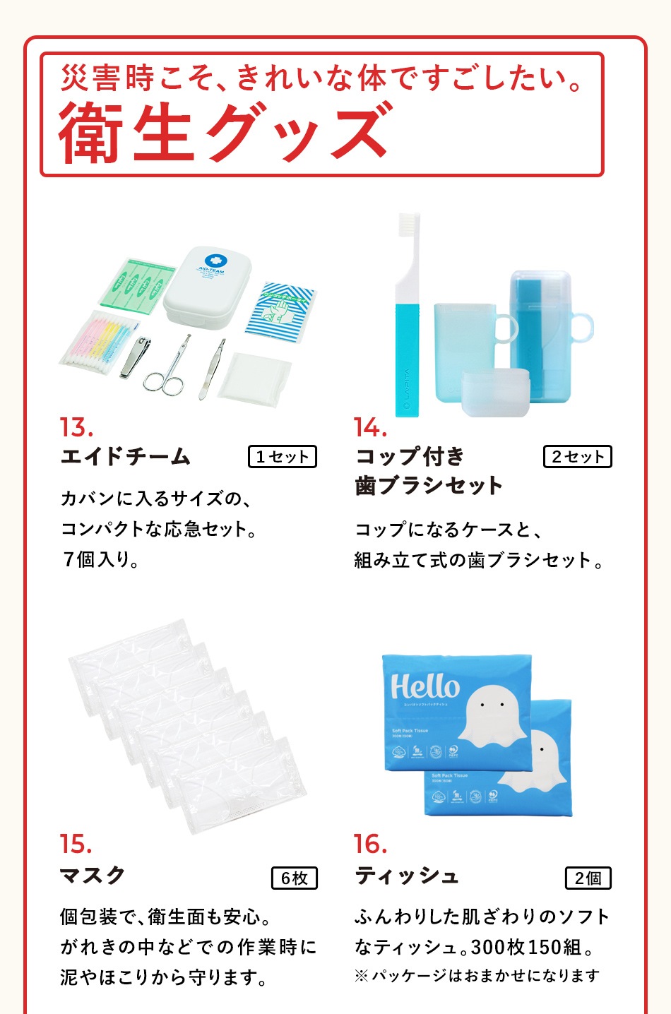防災セットのセット内容は、商品の入荷状況によって商品パッケージが違う場合や品質が同等の商品で代替対応させていただく場合がございます。予めご了承ください。
