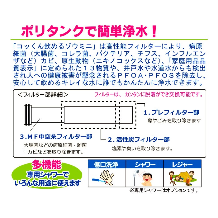 ポリタンクや給水車から貰った水は使用環境により細菌が発生します。このポリタンク型浄水器なら発生した細菌を全て除去!