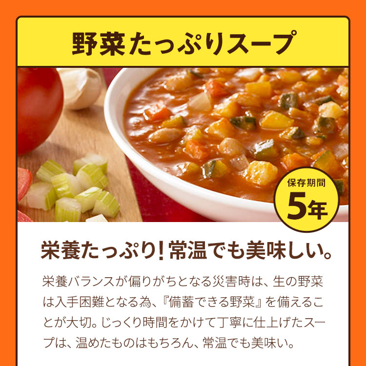 パンの缶詰や野菜スープなど、バランスよく組み合わせた全27品の非常食セット。防災士監修のハンドブック付きで、災害時の備えにも安心。不足しがちな野菜をたっぷり摂れるスープとジュース、スープにぴったりのおいしいパンをセレクト。パンはランダム封入で、開ける楽しみも。非常食レストランシリーズの人気商品です。