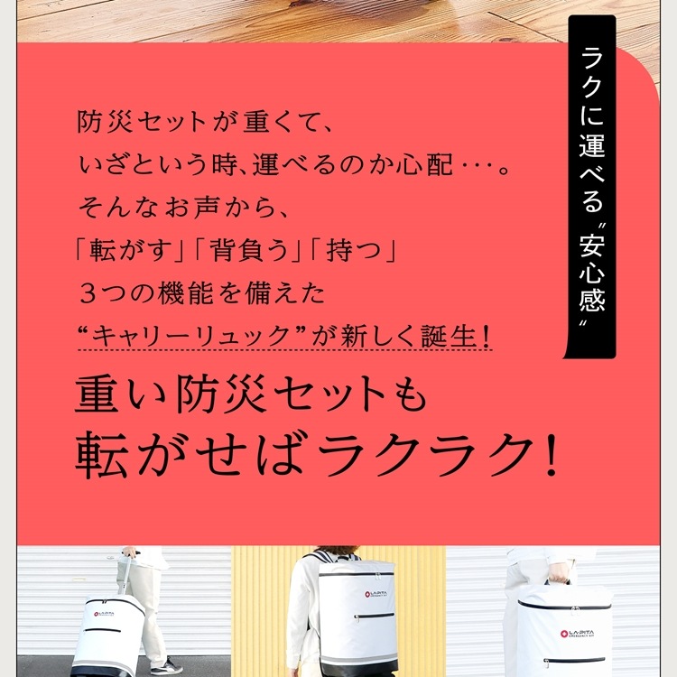 リュック バッグ 非常用持ち出し袋 スタイリッシュ デザイン性 背負う 鞄 かばん バック 撥水 水を弾く ブラック ホワイト 白 黒 転がす キャリーバッグ リュックサック バックパック ぼうさい LA・PITA ラピタ ラ・ピタ 防災グッズ 防災グッツ 防災グッヅ 防災用品 避難用品 地震対策 災害対策 避難グッズ アットレスキュー 非常用