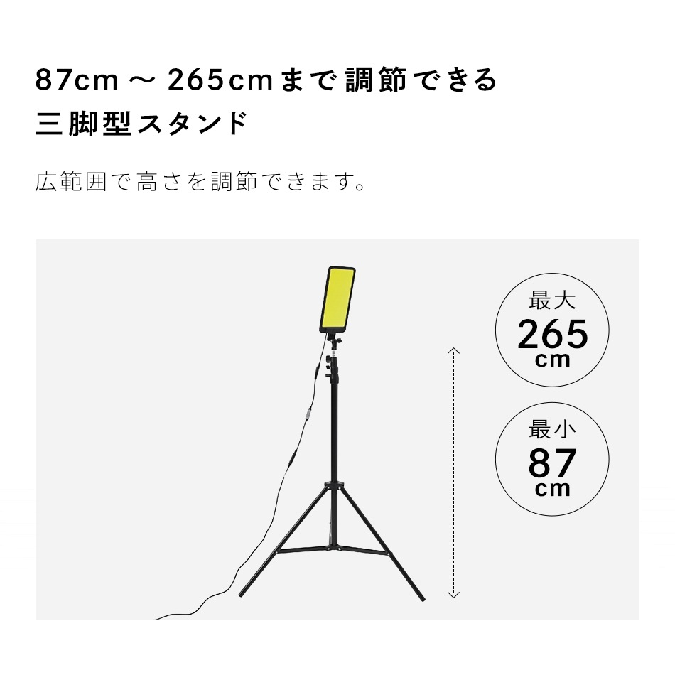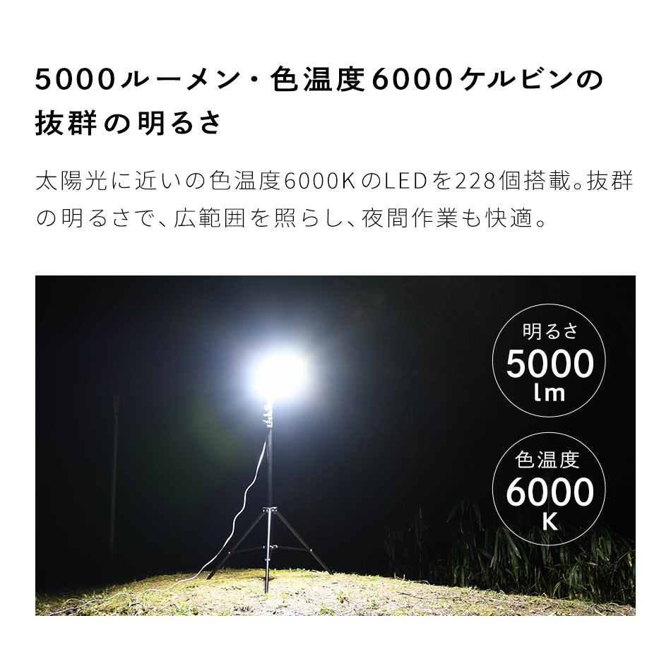 スタンド部:約横63.5cm 高さ約87cm~265cm光源 LED:5000ルーメン 電圧 12V 出力電流 ピーク時最大12A 電源コードの長さ 約5.3m 重量 約1,750g 色温度 6000K 防水等級 IP67 LED灯数 228個 ライト寿命 3000h セット内容 ●LEDヘッド ×1