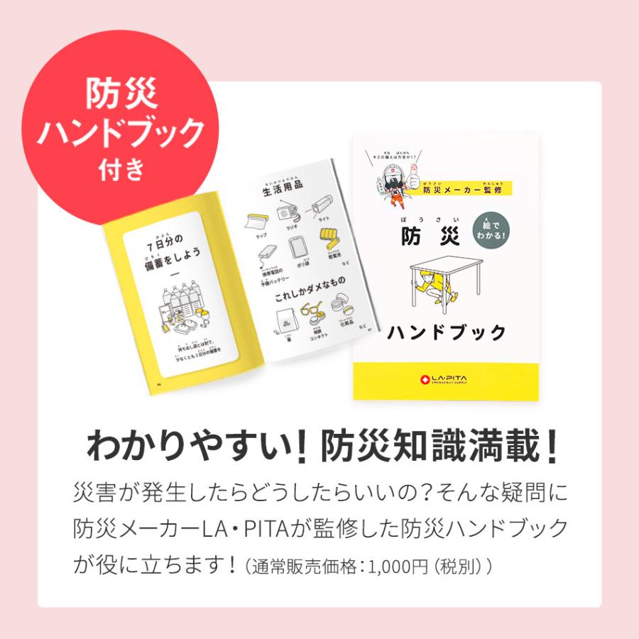 【材質】ポリエステル、アクリル、その他防災ハンドブック×1 避難時の注意や応急処置の心得など、防災に関する情報を記載したハンドブック(全86頁)。 取扱説明書×1 キット内容や作り方などを記載しています。 【関連ワード】 母の日 Mother's Day ギフト プレゼント 贈り物 引き出物 快気祝い 結婚祝い 引出物 出産内祝い 引っ越し 引越し お返し お祝い 防災士監修 防災用品メーカー監修 ギフトキット 防災キット 防災セット 地震対策セット 防災グッズ 長期保存水 保存食 防災用品 災害 地震 家族 女性 男性 おすすめ テレビCM防災グッズ アットレスキュー 防災セット LA・PITA 避難セット 地震対策グッズ 震災グッズ 災害 グッズ 災害支援 被災者支援 豪雨対策 テレビCM放送中 CM 防災セットはラピタ TVCM ラピタ LAPITA LA・PITA