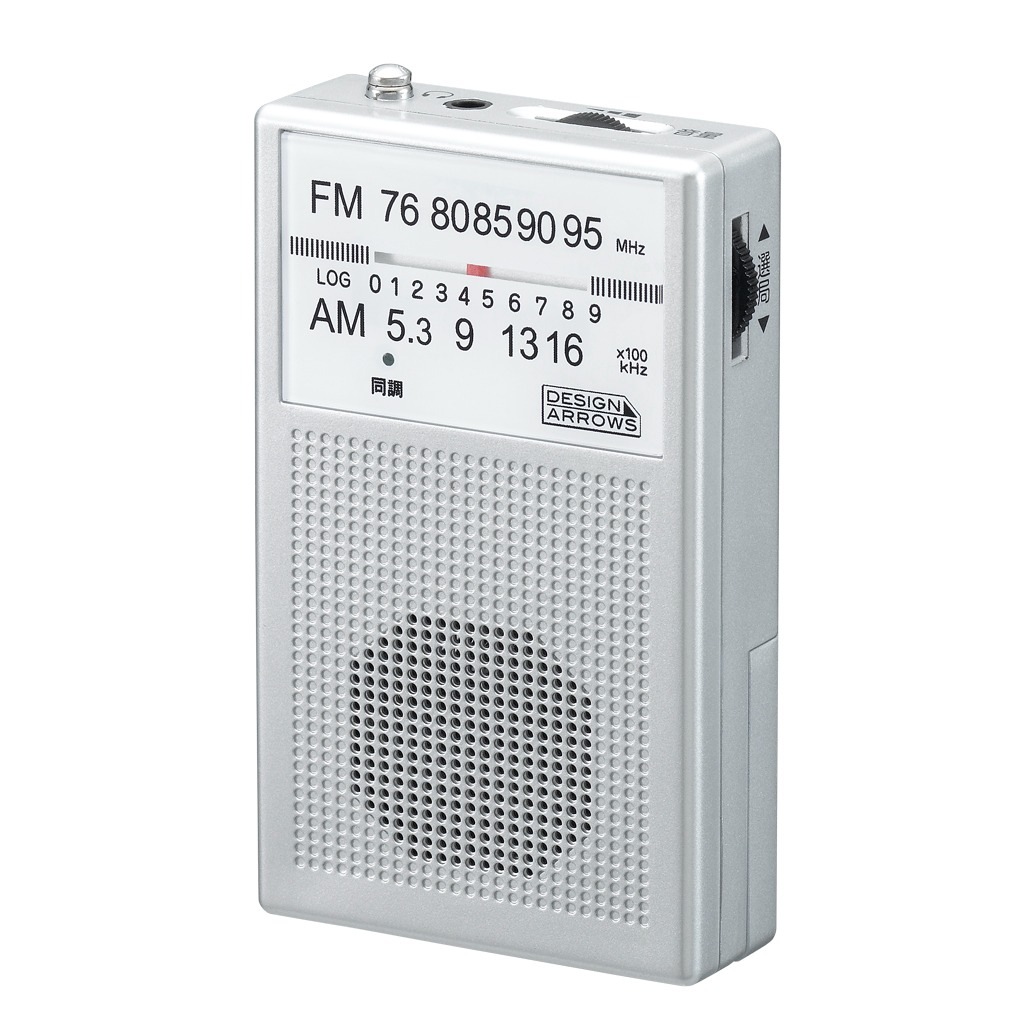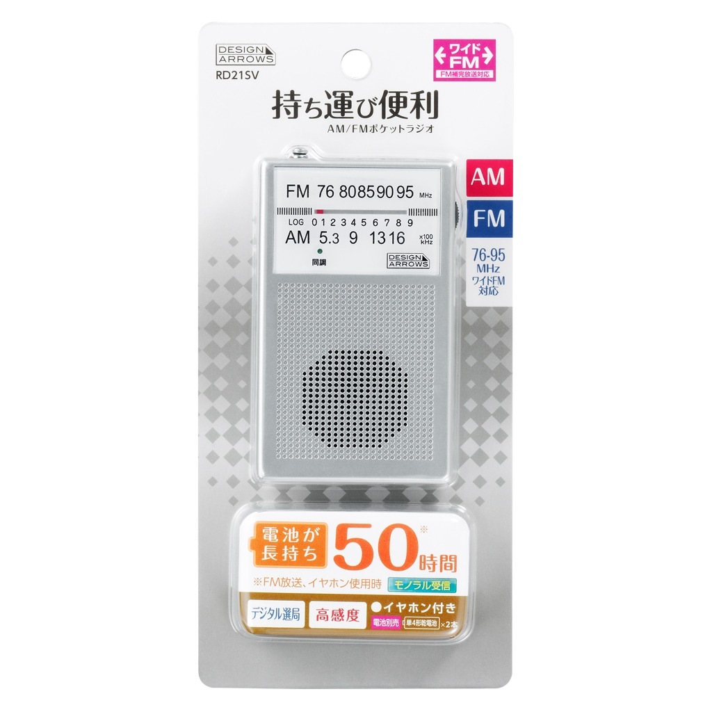 ・使い分け自在、内蔵スピーカー&イヤホン対応(付属)製品型番 RD21SV カラー シルバー 商品サイズ W55mm×H91mm×D19.5mm 商品重量 約63g 材質 ABS 使用電池 DV3V 単4乾電池×2本(別売) 連続使用時間 スピーカー時/AM:約49時間 FM:約45時間