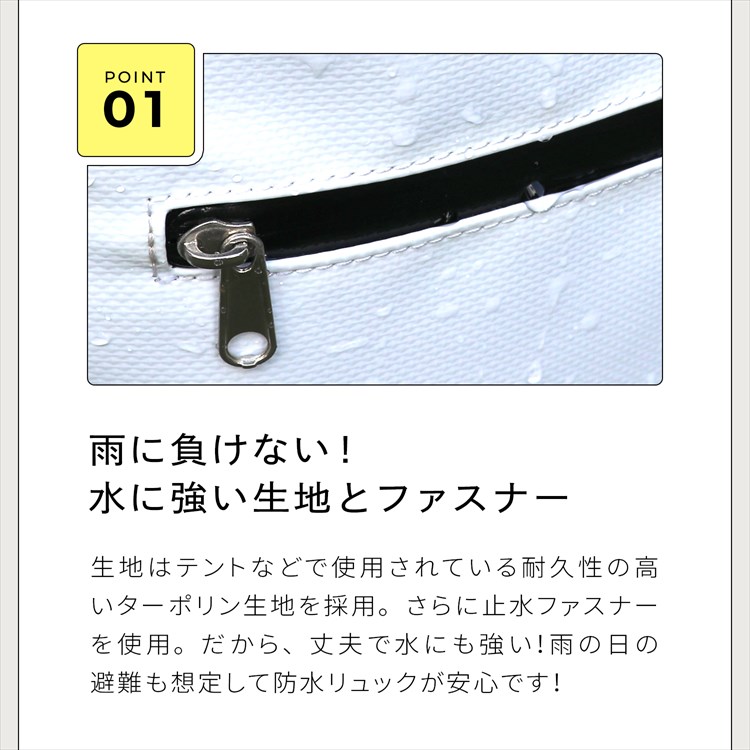 - 防水性優れた高機能避難リュック。リュック生地にはテントにも使用されるターポリンを採用。止水ファスナーなので開口部への雨水の侵入も防ぎます。