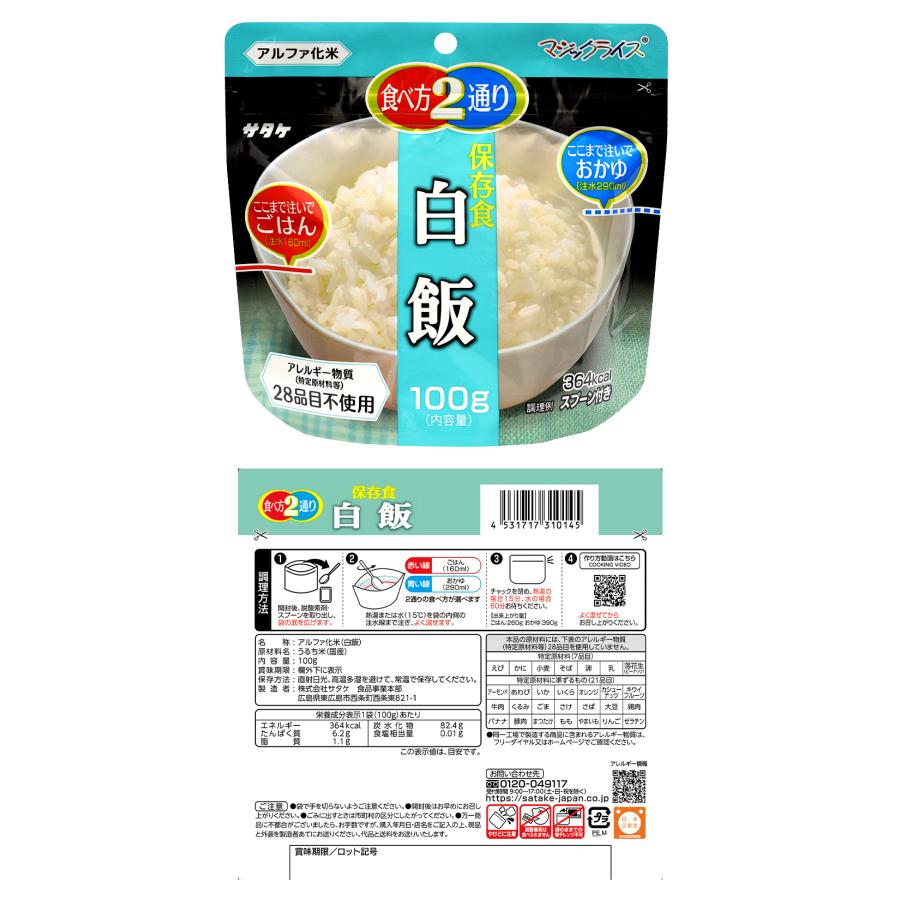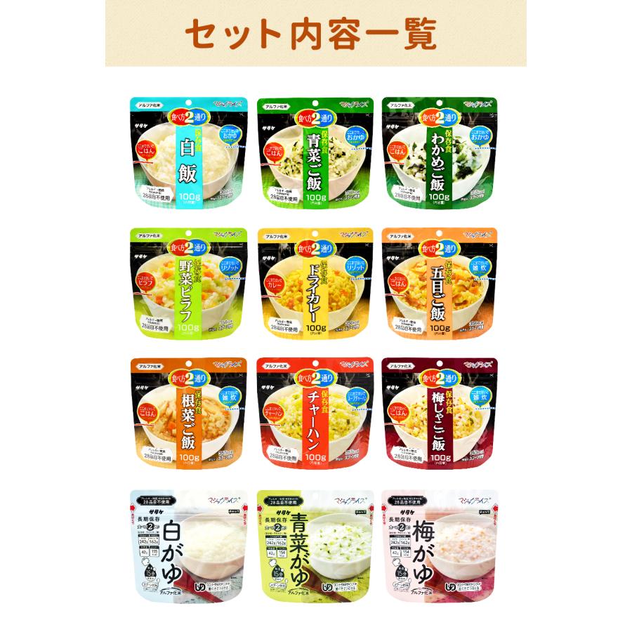 セット内容 白米、五目ごはん、わかめごはん、青菜ごはん、チャーハン、梅じゃこごはん、根菜ごはん、白がゆ、梅がゆ、ドライカレー、青菜がゆ、野菜ピラフ(各1袋/計12袋)
