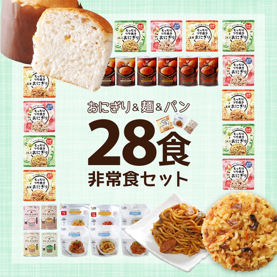 もっちりつや炊きおにぎりと麺とパンの28食セット 簡易食器セット付 【送料無料】 保存食 5年保存 非常食セット