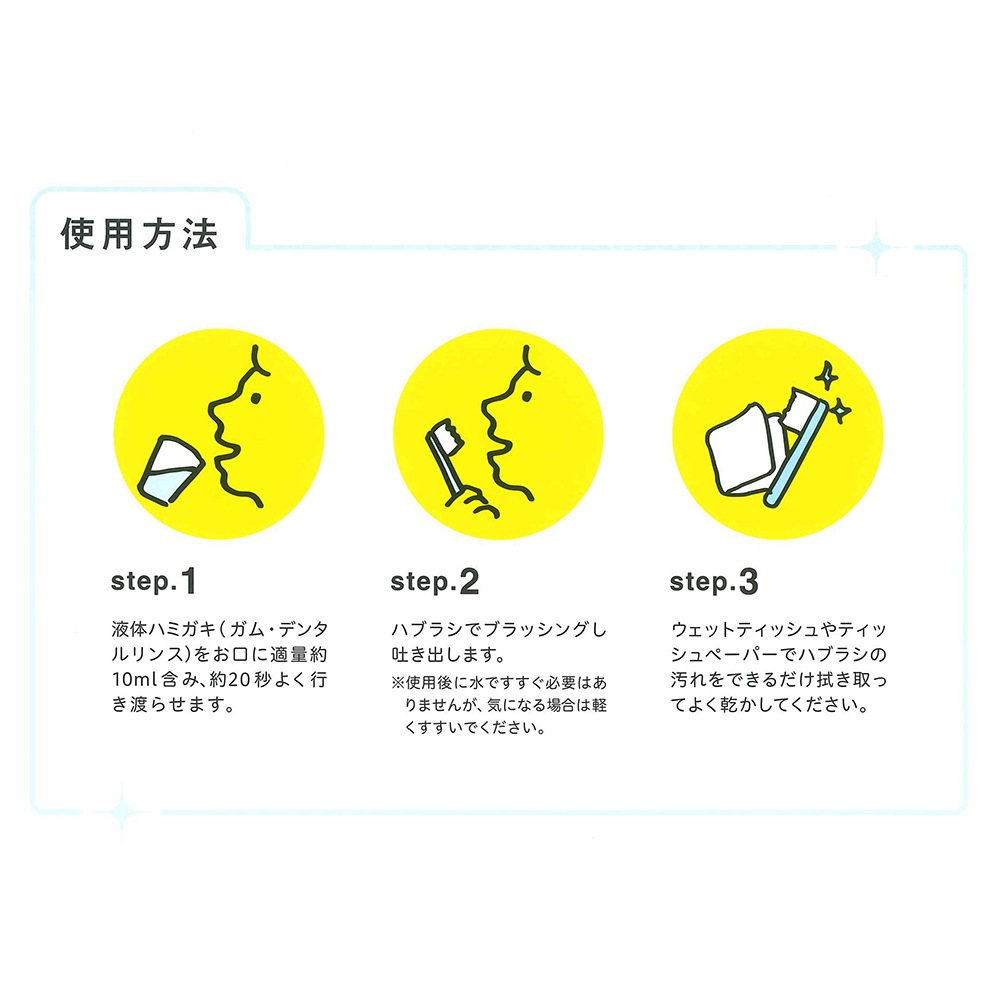 ●災害避難時など水が少ないときにも歯が磨ける液体ハミガキです。