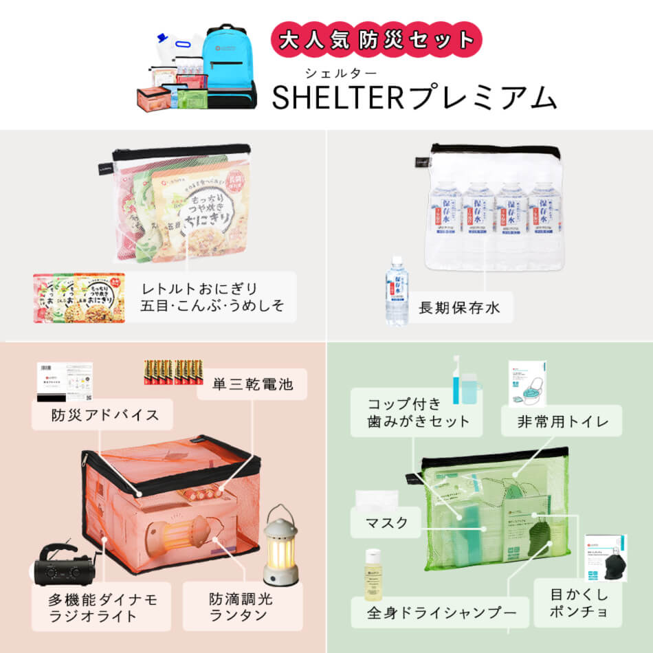 約2億商品の中から楽天総合ランキング1位を獲得した防災セットSHELTERシリーズ。 軽量・大容量リュックに災害時に役立つさまざまなアイテムを取り揃えたスタンダードセット。セット重量 総重量 約6.0kg SHELTERリュック×1 カラー4色:レッド、ターコイズ、オレンジ、ブラック