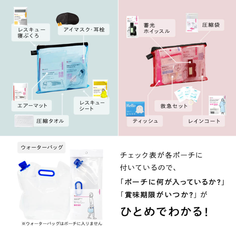 袋サイズ:35cm×42cm蓄光ホイッスル×1 蓄光素材が埋め込まれているので、普段から光を蓄えて暗闇でも光るから見つけやすい。緊急時には大音量100dbで助けを呼べます。 ウォーターバッグ×1 容量:10L