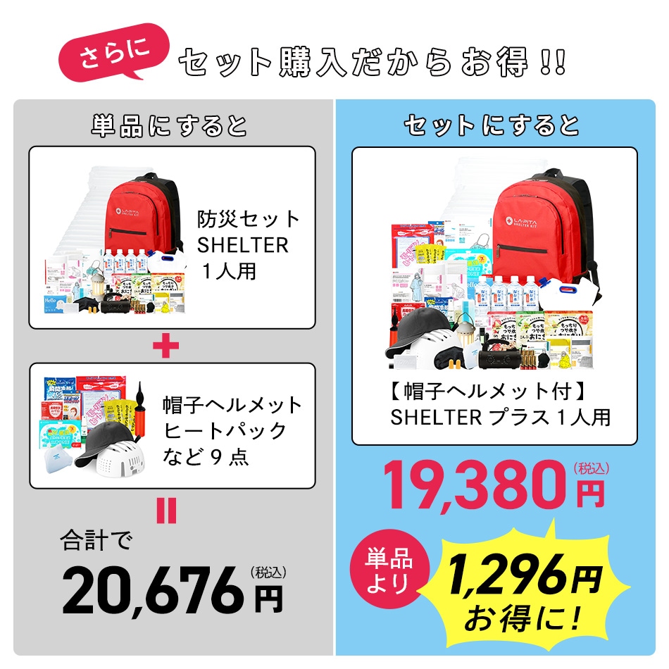 【今だけプレゼント中!】【45点/帽子ヘルメット付】防災セットSHELTER(シェルター)プラス 1人用 防災士監修 厳選防災用品