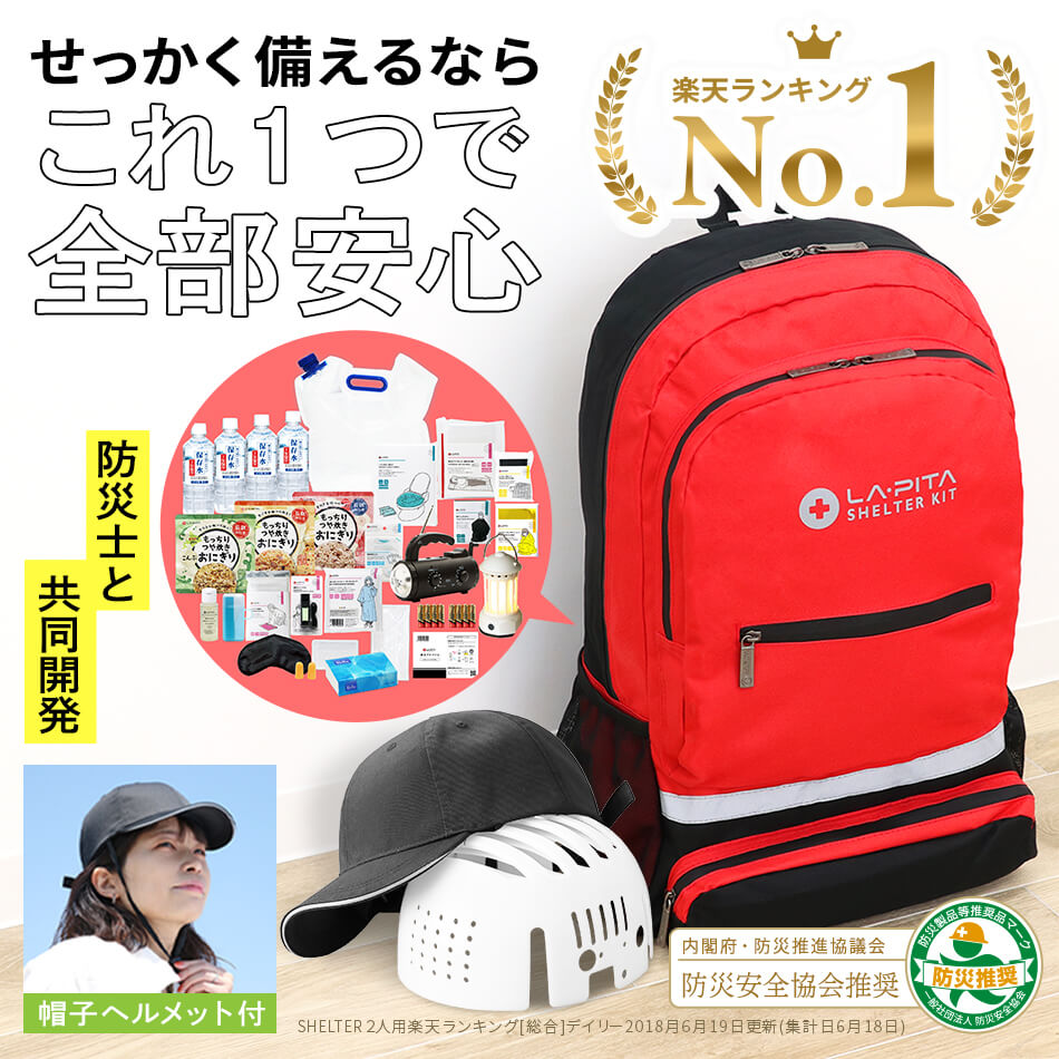 材質:ABS/PE取扱説明書×1 防災セットの商品リストや注意事項などを記載しています。 【関連ワード】防災グッズ アットレスキュー 防災セット シェルター プラス ヘルメット 災害対策 避難用品 非常用 リュック 撥水 赤 レッド ターコイズ ブルー 水色 青 オレンジ 黒 ブラック 非常持ち出し袋 非常持ち出し おすすめ リスト 最低限 経験者 地震対策 地震対策グッズ 震災グッズ 避難セット 避難グッズ 避難防災セット 避難リュック 避難・持出用品 災害 グッズ 災害 リュック 水害対策 防災 セット リュック 非常時用 災害支援 被災支援 デザイン性にこだわりオシャレな防災セットと評判 テレビCM放送中 CM 防災セットはラピタ TVCM