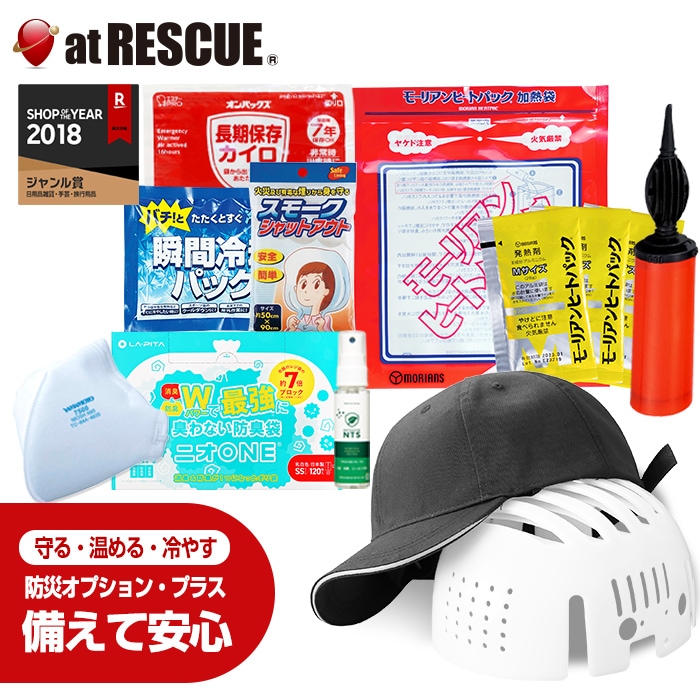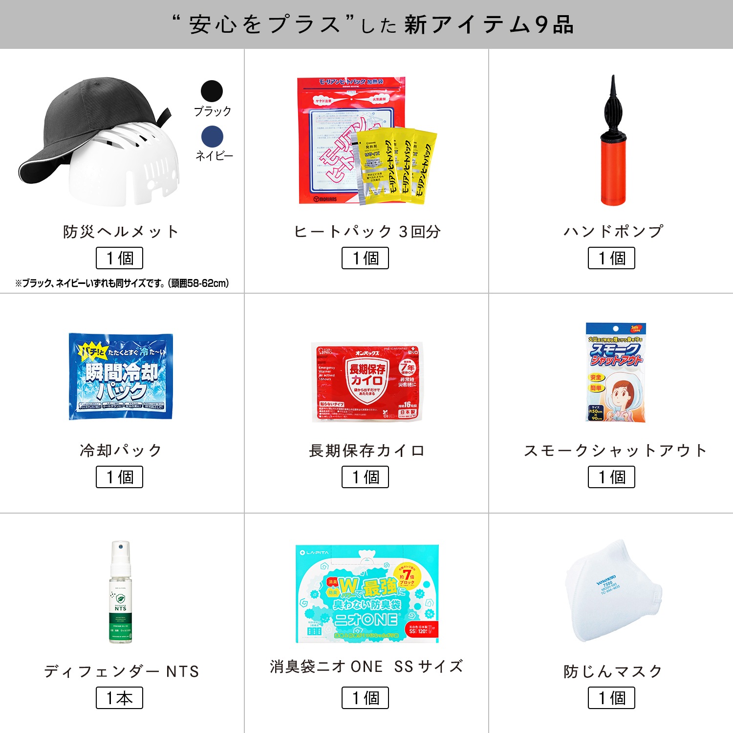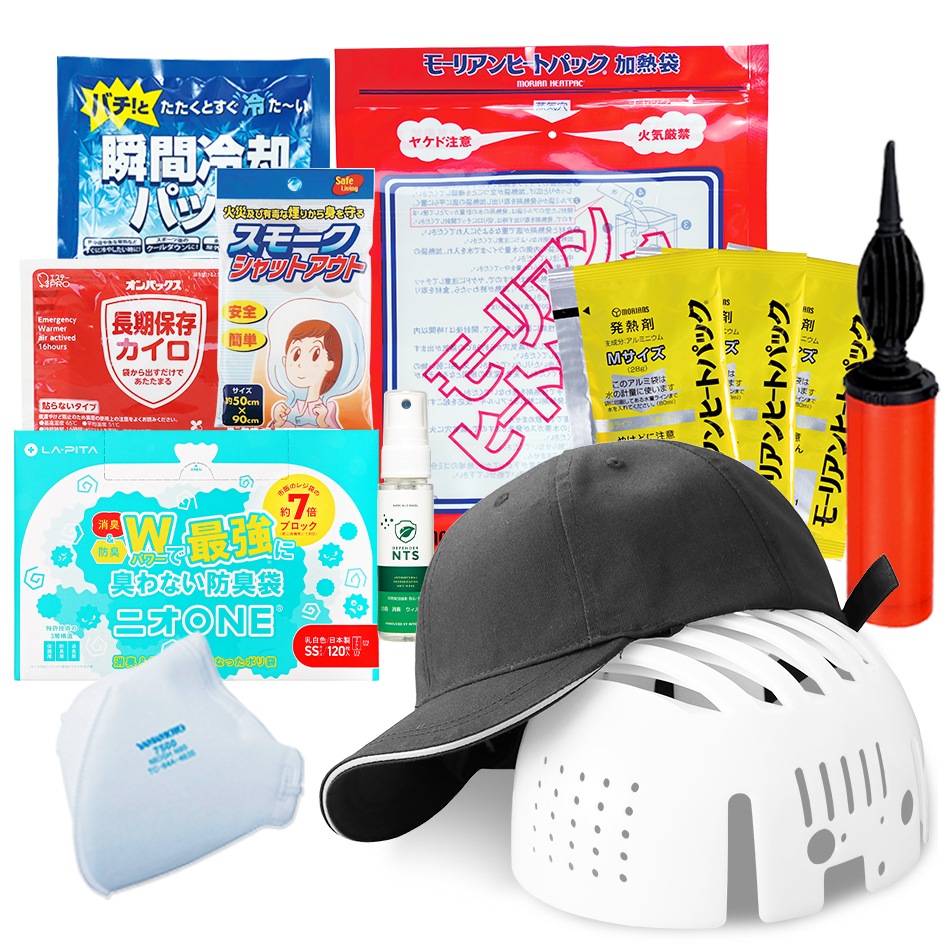頭部を守る帽子型ヘルメットや、食材を温められるアイテム、防寒・遮熱グッズ、さらには臭いや粉塵・煙から身を守る対策用品まで揃ったちょい足し用のセットです。すでに防災セットをお持ちの方も、これひとつで快適さと安全性をワンランク上に引き上げられます。